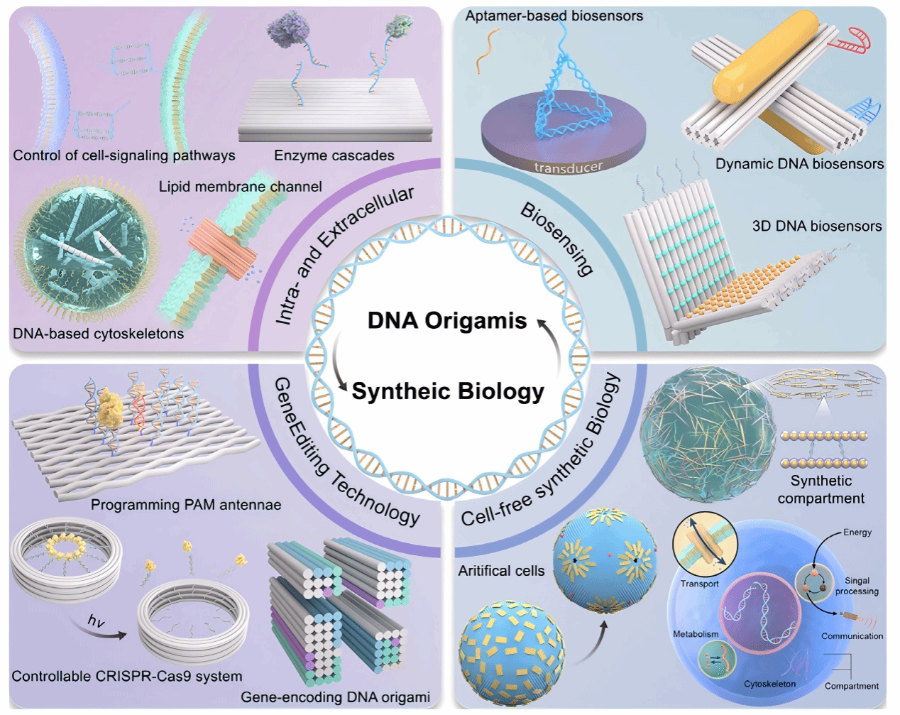 DNA 折纸(DNA Origami)和合成生物学(Synthetic Biology)是生物技术领域的两大颠覆性技术。该综述首次系统总结了DNA折纸技术在合成生物学领域的最新进展,重点从细胞外至细胞内的精准构建与动态调控以及无细胞合成生物学两大角度展开。DNA折纸技术能够通过精准编程核酸自组装,构建出具有空间可寻址性的纳米结构。在生物膜领域,DNA折纸可通过框架引导组装策略重建脂膜形状、修饰脂质体仿生细胞膜功能或嵌入膜通道调控物质运输以应对环境变化。固定在细胞膜上的DNA折纸通过搭载信号分子(如适配体、抗体)或链位移反应可介导细胞间通讯,模拟自然信号转导途径。在模拟细胞骨架方面,刚性DNA框架支撑细胞形态并引导胞内蛋白有序排布;其蛋白网络组装能力可精确组织多酶级联反应路径,显著提升代谢效率。此外,DNA折纸不仅可以编程PAM位点,提高编辑效率,还可通过“锁扣”结构实现时空可控的基因编辑。此类系统可用于构建智能基因回路,实现细胞行为的精准编程。在无细胞合成生物学中,DNA折纸骨架为多功能分子机器和结构提供标准化支架,高效组织无细胞表达系统,推动合成生物回路和分子工厂的开发。这些跨尺度应用彰显了DNA折纸作为“分子画布”在整合生命系统模块、重塑生物学功能方面的强大潜力。