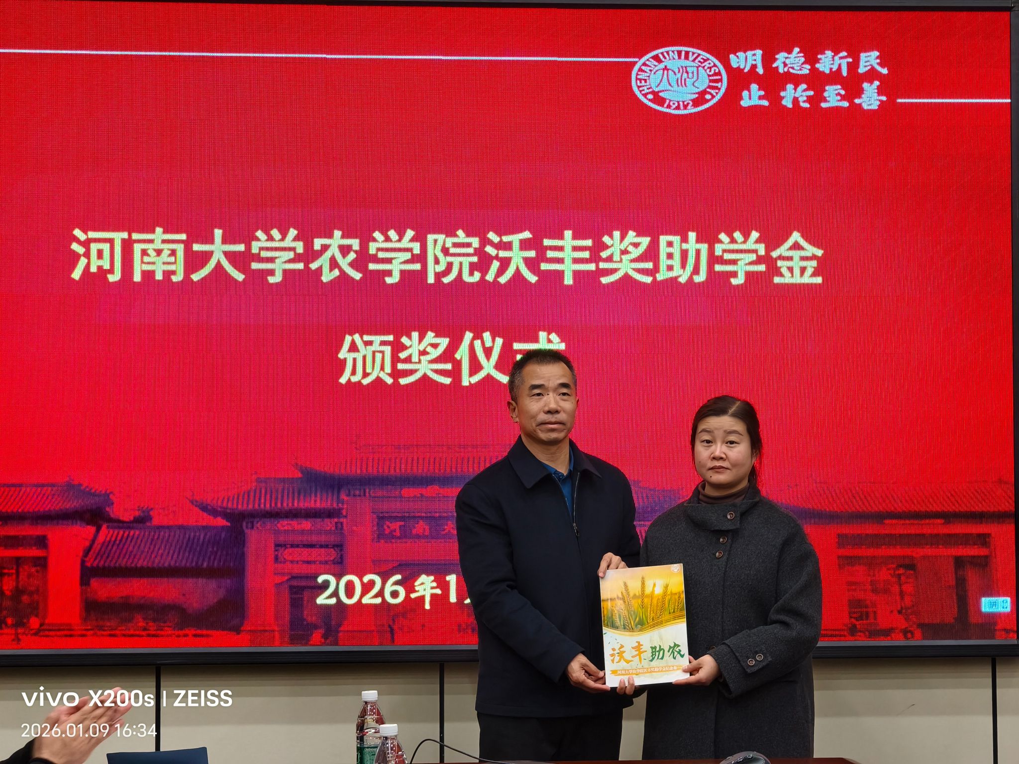 1 月9日下午,河南大学农学院沃丰奖助学金颁奖仪式在九章学堂南楼 C 座316会议室举行。河南沃丰农业开发有限公司总经理刘贯军、副总经理何珮佟,学校学生处副处长孙建杰,农学院相关领导和学生代表参加。仪式由农学院党委副书记曹玉辉主持。