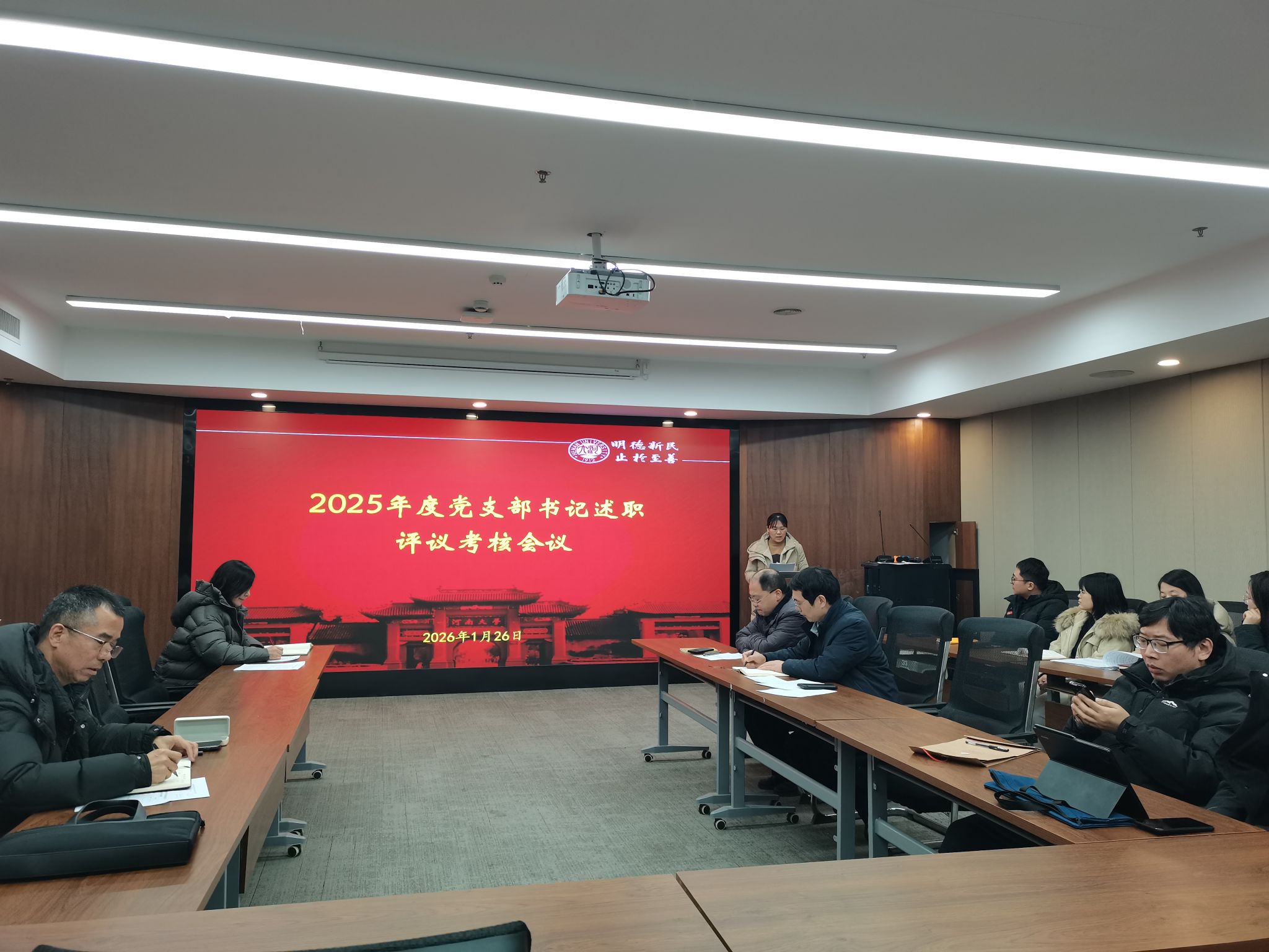教工党支部书记刘绪强和学生党支部书记关利平分别围绕2025年度党建工作履职情况逐一述职,聚焦政治理论学习、“三会一课”制度落实、党员教育管理、党建与教学科研融合、师德师风建设等核心任务,全面汇报工作成效、深入剖析存在的短板不足,并结合学科发展与支部实际,明确2026年改进方向与工作举措。述职过程中,两位书记实事求是、重点突出,既展现了党建工作的特色亮点,也体现了刀刃向内的自我革新意识。随后,学院执行院长王道杰对各党支部书记履职表现逐一进行点评。他既肯定了过去一年各支部在凝聚党员力量、服务学科发展、助力乡村振兴等方面取得的显著成效,也指出了支部存在组织生活形式单一、党建与业务融合深度不够、党员先锋模范作用发挥不充分等问题。接着,党委委员对各党支部书记年度履职情况进行了民主测评。