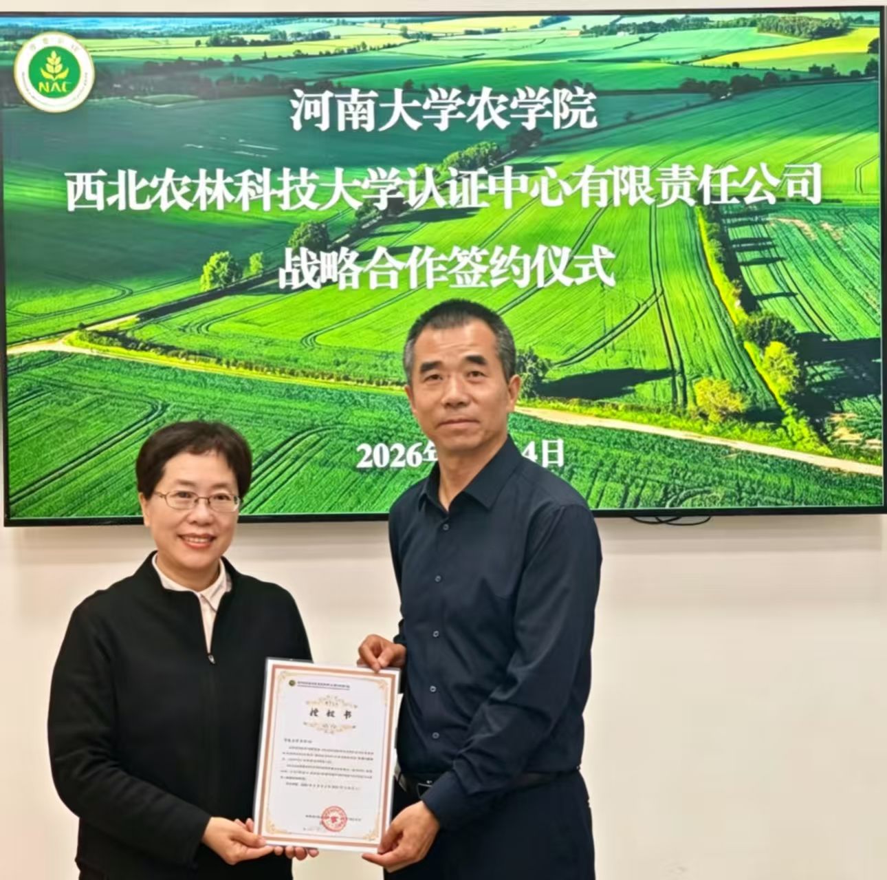 为深化校际合作、推动农业领域产学研协同创新,助力区域农业高质量发展,4月14日,我院执行院长王道杰、副院长李浩一行前往西北农林科技大学认证中心(以下简称“西农认证中心”)访问交流。此次到访是双方继3月19日初次座谈后的深度对接,双方围绕核心合作议题展开全面研讨,并正式签署战略合作协议,河南大学农学院获得西北农林科技大学认证中心全面授权,作为河南省唯一的“产学研”授权单位,可开展西农认证中心全资质领域范围内相关的认证、技术服务、评价服务、培训等相关工作,标志着双方携手开启校地农业科研与认证服务强强联合的全新征程。