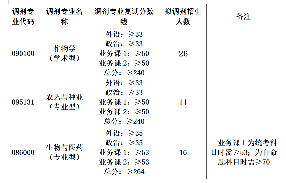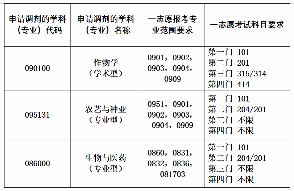 1.作物学(090100)优先从第一志愿报考作物学(0901)、园艺学(0902)、农业资源与环境(0903)、植物保护(0904)、草学(0909)专业的考生中,依次按初试成绩从高到低进行调剂。